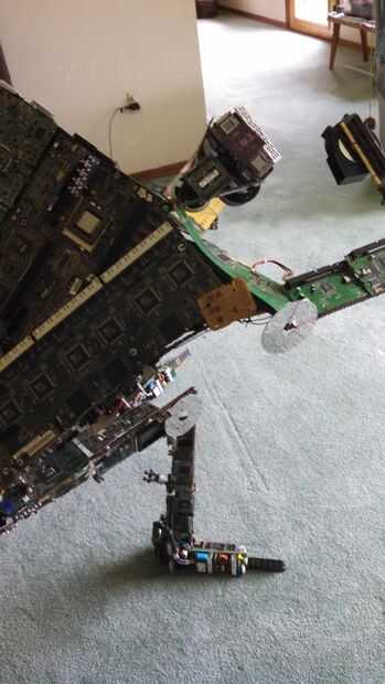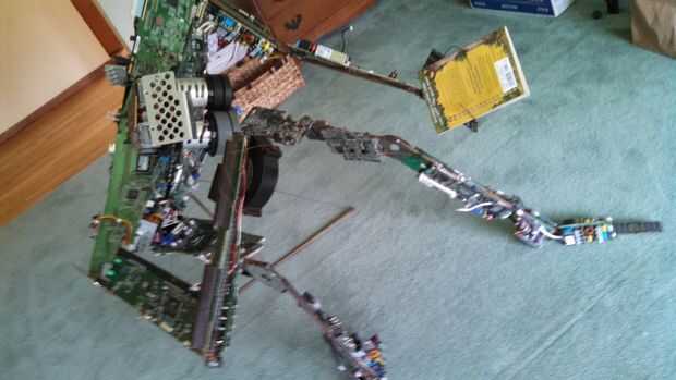 Estaba tratando de lograr una especie de mirada de "pensador", sin embargo se hizo de placas de circuito que quería ir más lejos, así que dio un libro para mirar, sin embargo sostiene hacia abajo para mostrar es incapaz de entenderlo. también coloca un ventilador en una mano como una alternativa a tener el soporte de cabeza en el, sintió que se muestra el robot sobre la calefacción de tratar de entender lo que sostenía.