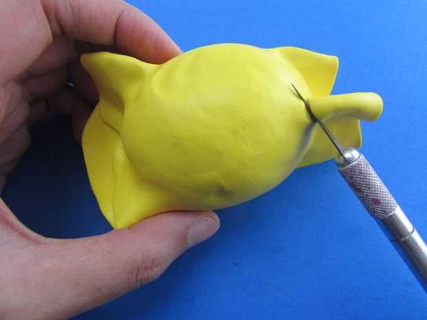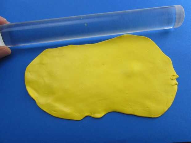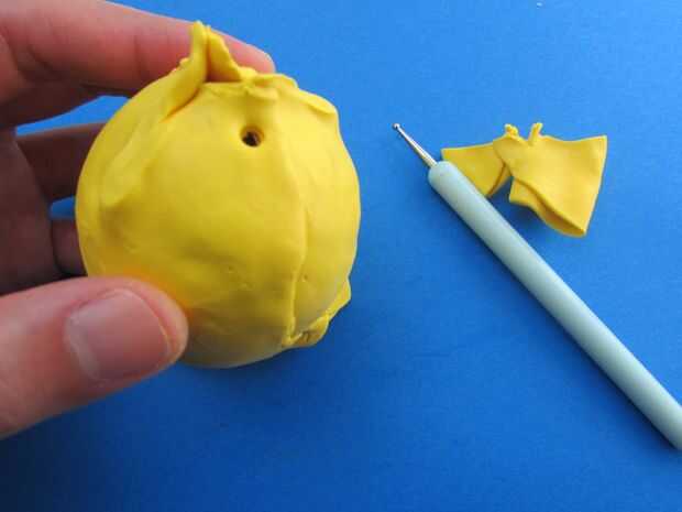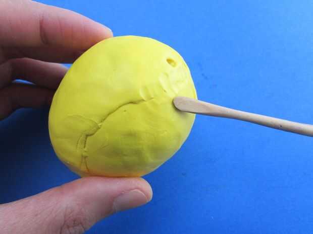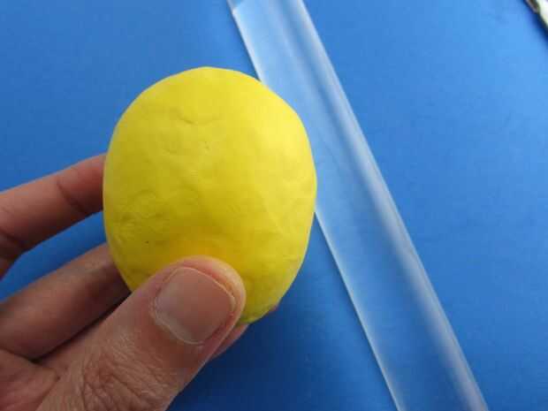 Una vez que el huevo se secó, untó lo con arcilla líquida luego que envuelto con una hoja aplanada de unos 4mm de la arcilla del polímero amarillo. Utiliza el cuchillo para cortar el exceso y se aseguró de que la arcilla esté bien adherido al huevo y no hay burbujas de aire. Si usted encuentra algunas burbujas de aire, sólo pincha con una aguja y empujar la arcilla hacia el agujero para expulsar el aire hacia fuera.