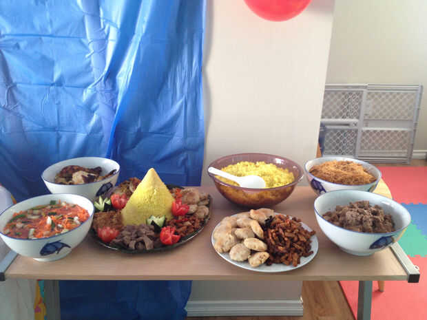 Y como esto es east meets west, Indonesia alimentos. Puesto que esto está celebrando a un bebé da vuelta uno, nos sirve el huésped con cono en forma de coconuty arroz amarillo, que es un tipo especial de delicadeza para celebraciones en Indonesia.