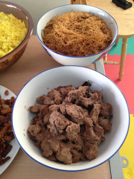 Calor 2 cucharadas de aceite de oliva y saltear pasta de tamaño mediano 1 cebolla con ajo 3. Añadir el resto de los ingredientes (se pueden añadir zanahoria en cubos, arvejas, maíz, seta), revuelva bien. Añadir condimentos como Royco marca o marca de Vegeta (o tan simple como la sal y un poco de pimienta blanca). Gota 3-4 gotas cada salsa de soja y aceite de sésamo justo antes de retirar del fuego, agregue el cebollín en rodajas/picado y perejil (no los rizado tho!). Si usted puede encontrar apio asiática, también es deliciosa para agregar.
