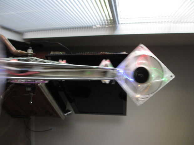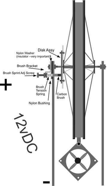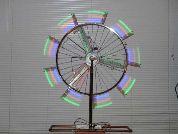 Este artilugio fue construido como una obra de arte cinética (una vez más usted puede sacar sus propias conclusiones "crítico de arte"), sin embargo se podría fácilmente ser re-purposed para manejar una carga de lo que su imaginación concibe. En medio de la rueda son un conjunto de Hokey radios (www.hokeyspokes.com) para añadir algunos patrones de iluminación de POV. Nota: Esta versión una... para la versión que dos planeo utilizar mi propia cadena de cadenas de LED HL1606 impulsado por un Arduino y probablemente utilizo ventiladores más potentes, cojinete de bolas.