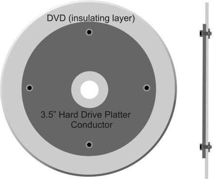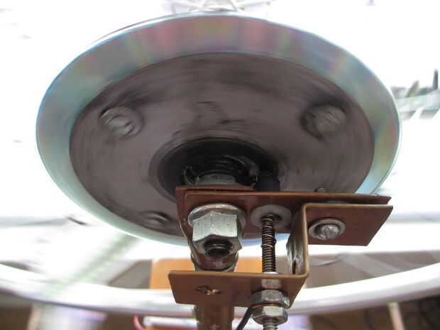 Esta Asamblea es de un plato de un disco duro (fallido) y un DVD (o CD) y atornillada entre sí. El frente de la Asamblea pone en contacto una escobilla de carbón comúnmente en motores eléctricos y se monta en una capa aislante (DVD) y el montaje completo se fija en el eje de la rueda de bicicleta (utilicé pegamento del silicio). Uno de los pernos en este conjunto de spinning tiene un cable conectado a él y transmite electricidad a los ventiladores montados en el perímetro de la rueda.