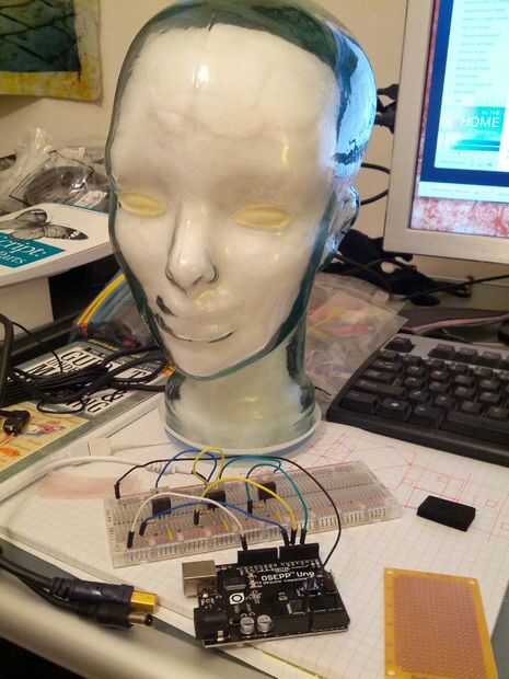 Una nota sutil: con mi cabeza particular cuando las luces apagado y los LEDs, los ojos eran un poco difíciles de escoger. Para ayudar a tu cerebro a reconocer la forma como una cara, me puso una capa de cinta adhesiva transparente sobre los ojos y recortar con una cuchilla de afeitar. Una solución sencilla!