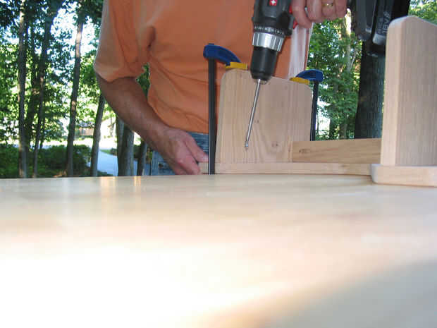 Reuní el estrado de mi pies usando los tornillos y los agujeros de bolsada. Construcción de agujero de bolsillo ofrece carpintería sólida roca que a menudo no requiere encolado. Si no tienes una plantilla de agujero de bolsillo es fácil de perforar ángulo para clavar las piezas juntos. Si clavado, asegúrese de agregar el pegamento para la fuerza adicional. Sujeción de las piezas antes de atornillar o clavar es a debe.