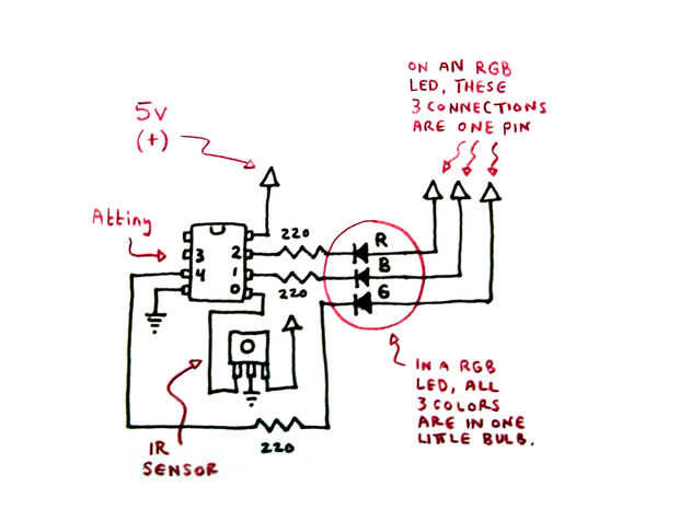El circuito debe ser sensible a un clic del control remoto. La manera que esto funciona es que el fototransistor IR realmente está sintonizado para ver para los pulsos de luz que destella en 38kHz. Esto es el uso de controles de frecuencia y todo el sistema extraordinariamente sensible, incluso a través de la cáscara de huevo. (Para más información sobre esto, ver de ladyada escribir aquí: http://www.ladyada.net/learn/sensors/ir.html) Nos estamos no realmente la codificación de los impulsos aquí - todo empuja el botón significa lo mismo para este circuito ("Go!"). El fototransistor es accionado por las baterías y salidas de alimentación con el conector de la salida cuando detecta el parpadeo remoto a 38 KHz. Mientras que la patilla conectada Attiny no tiene voltios (es baja), no hace nada. Cuando va alto (potencia entregada), señales el Attiny para cambiar el color del LED.