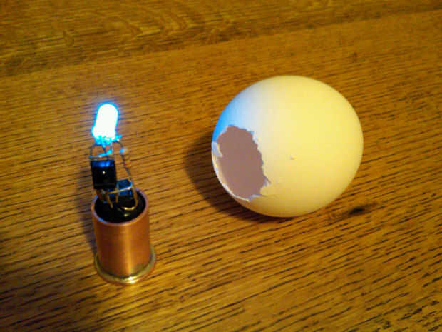 Para dar a todo el conjunto algo de peso y un punto de apoyo, soldado un trozo corto de tubo de cobre en un centavo. Las baterías apiladas para arriba (envueltas con cinta) están dentro del tubo,