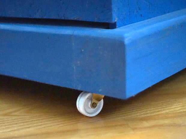 Voltee la base 4 x 4" y tornillo-en las ruedas cerca de las esquinas. Si realmente quisieras, no sería difícil de las ruedas se hunden en la base para que no sientan la TARDIS es tan alto (y nunca volvería a ver los pies de los ocupantes, que pueden a veces ser visibles debajo de la TARDIS, porque éste no tiene un piso). En realidad, también sería difícil de poner un piso en la parte inferior. Sin embargo, la falta de un suelo permite estar dentro y mover el TARDIS, que es clase de fresco. También, tener 1.5" altura realmente ayuda si su TARDIS debe traducir a través del espacio que se cubre con una alfombra de la profundo-pila.