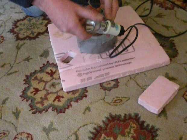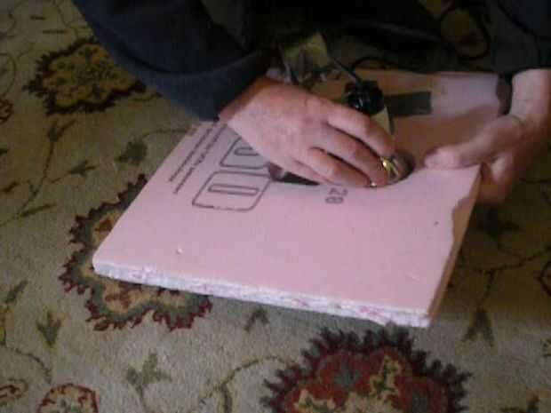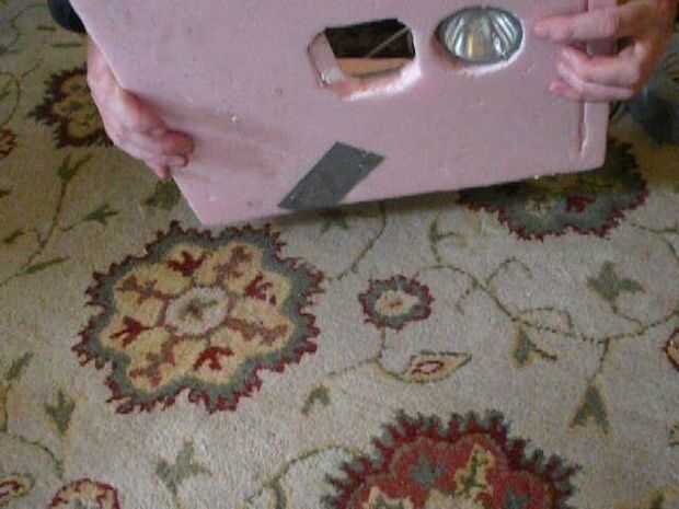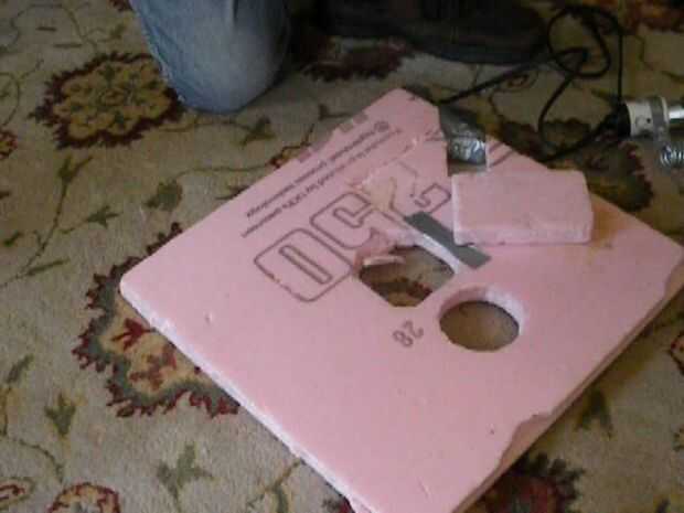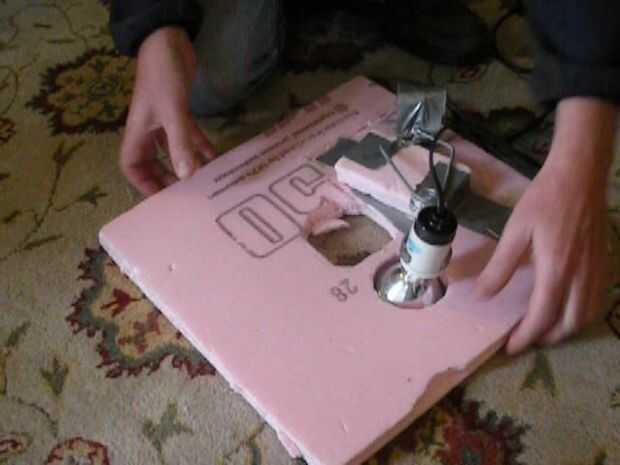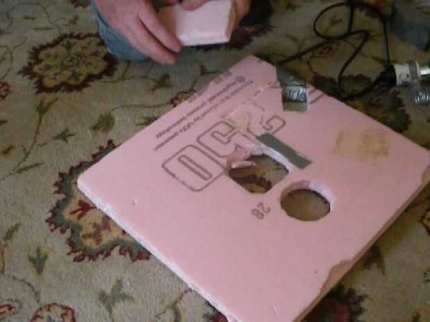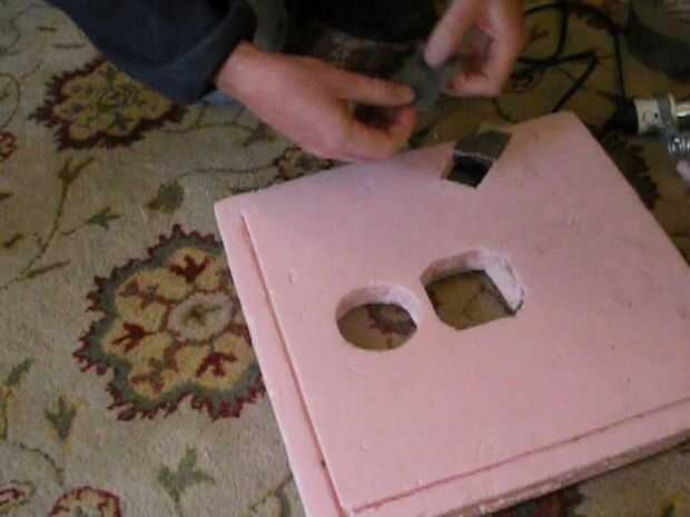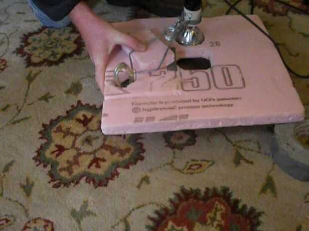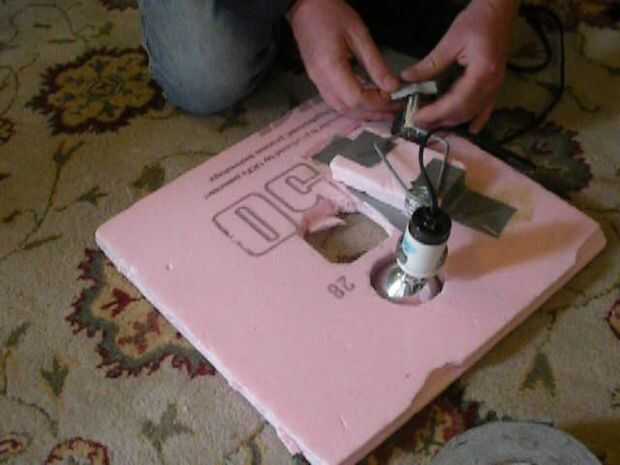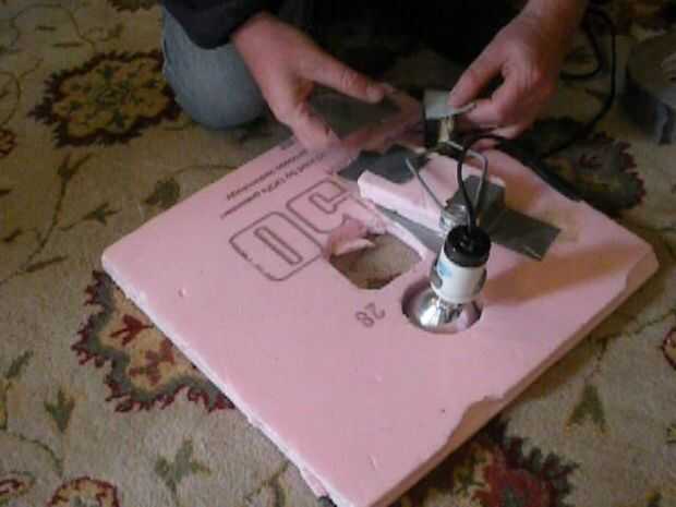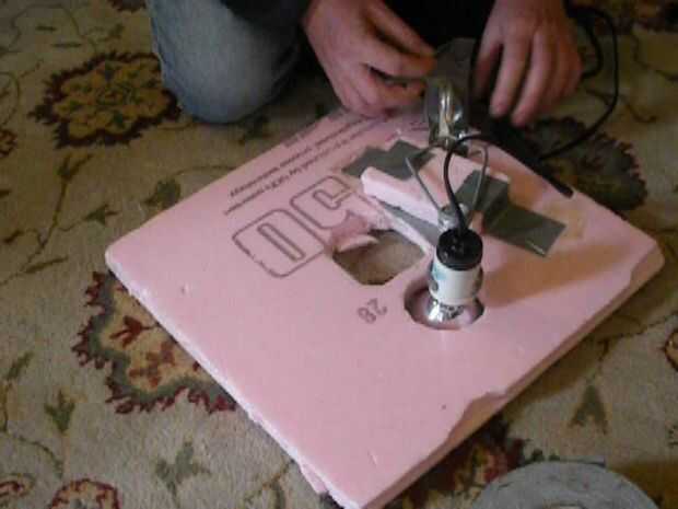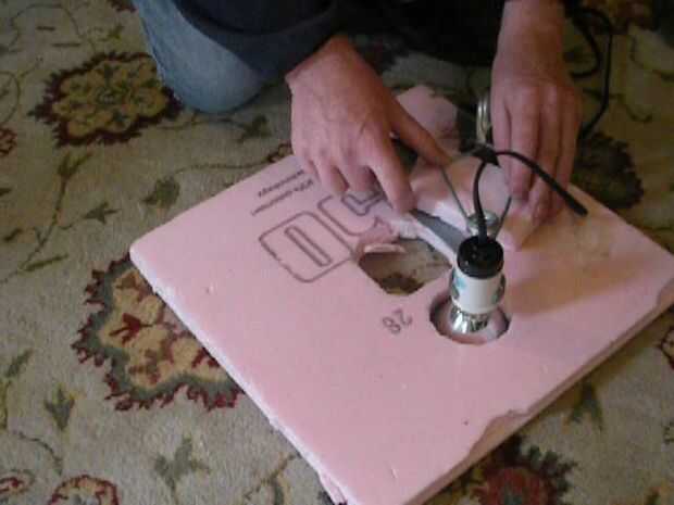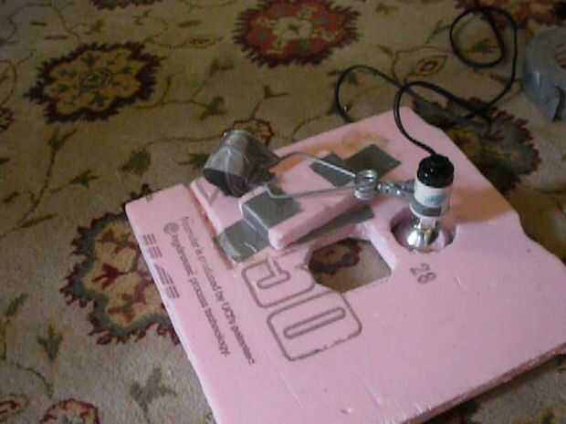 Nota la cara de la bombilla quede al ras con la parte superior del panel de la cámara. El agujero para la abrazadera de la lámpara se hace al ras con la parte superior del panel de la cámara mediante la adición de otro pedazo de cinta adhesiva a la base del agujero.
