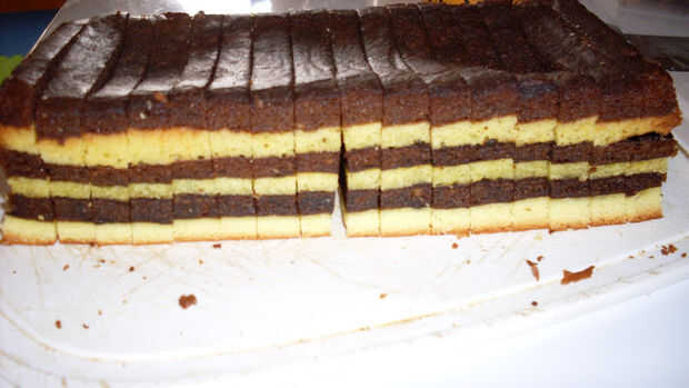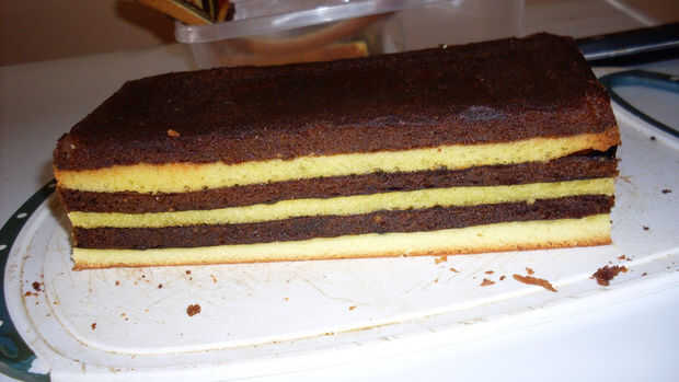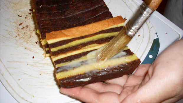 Una vez que la torta se haya enfriado, cortar en 12 porciones de 0,5 cm de espesor y apilarlos haciendo en textura de esterilla de bambú, uno hacia arriba, una hacia abajo. Coloque cada porción con el cepillado de la leche condensada, dejar de lado.