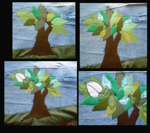 Trabajando capa por capa con entretela coser entonces puede crear un buen efecto de un verdadero árbol lleno de hojas. Tan cada capa fue interconectado hacia abajo con la plancha y luego cosido alrededor con hilo correspondiente. Esta es la parte que tomó más tiempo sólo por ser aseado y la cantidad de hojas que quiero tener en él. Un diseño más simple llevaría menos tiempo, por supuesto.