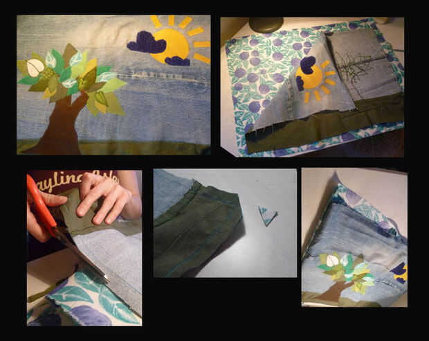 Pensé que parecía un poco desnuda, con sólo el árbol, así que coser un sol y unas nubes pana azul en el mismo proceso que las hojas. Así que el frente terminado y está listo para unirse a la parte posterior.