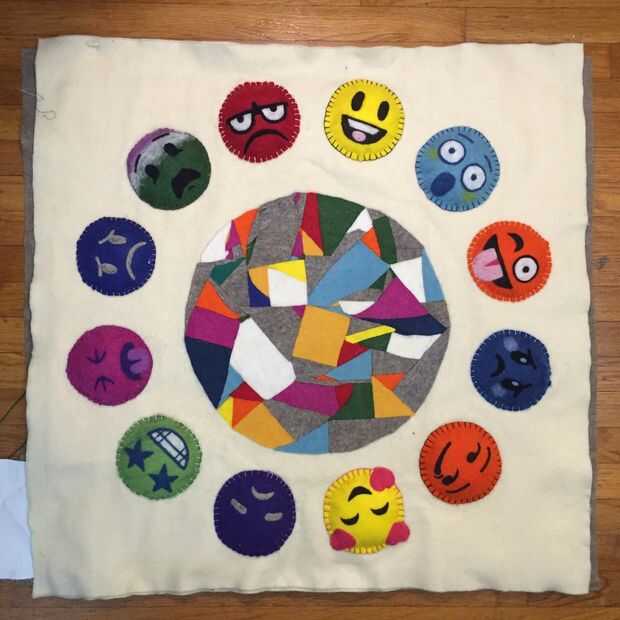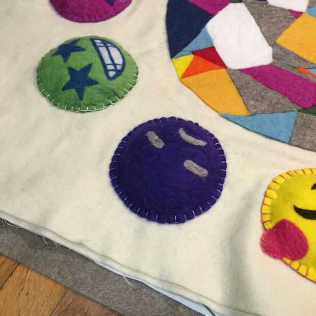 Con retales de fieltro, hacer el asiento para el niño en el centro de la estera. Usé plancha adhesiva para juntar todos los trozos en la capa superior. Fue manera más rápida que la costura. [TIP: utilice un trozo de tela de algodón al planchar el fieltro. Si utilizas fieltro de poliester, debe utilizar una hoja de tela de algodón de hierro. Si no, hierro quemará tu fieltro]