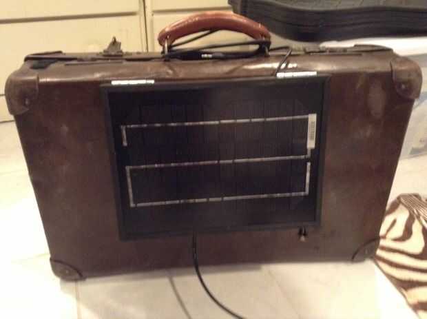 Quería montar el panel solar por lo que podía mover dependiendo de donde estaba el sol, y donde quería el estéreo señaló. Así compró un par de bisagras de mi almacén de hardware local, simplemente había atornillado en la parte posterior de la maleta y había atornillado el panel solar en las bisagras. Esto hizo muy fácil el hecho de que la carcasa metálica del panel solar tenía agujeros disponibles.