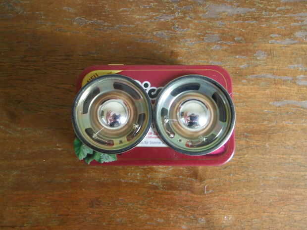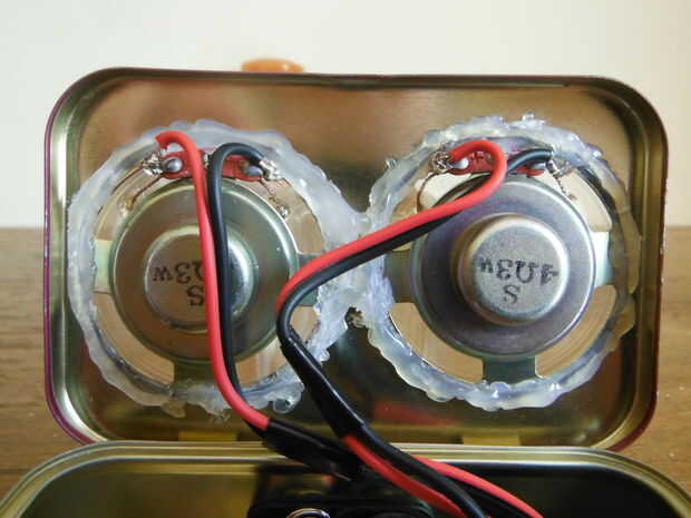 Ahora, ponga los altavoces en los agujeros que acaba de hacer y sellarlas bien. Para ello, puse una arandela de tubería de goma alrededor de cada altavoz en el exterior de la lata y luego selladas por los dos altavoces con pegamento epóxico en el exterior de la lata. Entonces, corrí una capa generosa de pegamento caliente en el interior de la lata que rodean los altavoces para asegurar un sello hermético.
