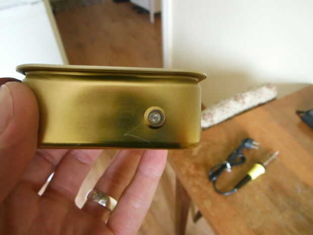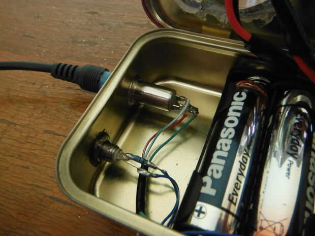 Ahora necesitas conectar tu amplificador, soporte de la batería, LED, interruptor y 3,5 mm jack. Sellado todo esto con una aplicación generosa de pegamento epoxi para asegurar un sello hermético. Dependiendo de su lata exacta y componentes, su colocación es muy probable que varía de mina.