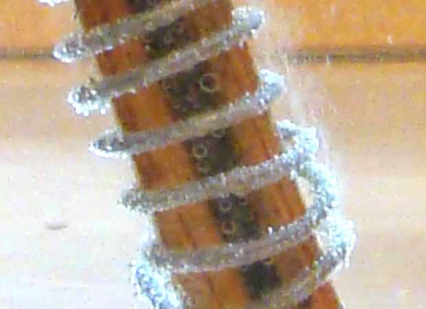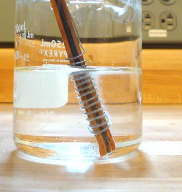 Parece magia, pero es justo electroquímica. Todo lo que necesitas es un lápiz, algún alambre de titanio y una batería para empezar a purificar el agua. La tensión entre el grafito y el titanio convierte H2O y un poco de sal de mesa (NaCl) en NaClO, hipoclorito de sodio, también conocido como lejía. Ejecutar la reacción durante unos minutos, comenzará a oler como una piscina y el cloro matará la bacteria en el agua. Para base de cloro agua productos de la purificación, es bueno esperar al menos 30 minutos para el cloro hacer su trabajo. Si esperas más tiempo, el cloro se descompone en NaCl y oxígeno.