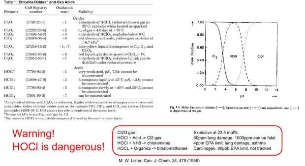 Como se puede ver, mezclar el blanqueador con ácidos, amoniaco o materiales orgánicos crea productos muy dañinos. Esto es significativo, teniendo en cuenta que la aplicación es el desierto. Supongo que algunos animales (o humanos) ha orinado en el agua potable. Así que aportará algunos amoniaco, y que reacciona con el cloro para hacer las cloraminas, que son perjudiciales para los pulmones. O tal vez hay algún ácido de fruta cercana o lluvia ácida; entonces es posible que gas de cloro en las manos, que fue utilizado como arma química en las guerras mundiales. O si deja la reacción corriendo demasiado, puede que tenga más compuestos de cloro completamente oxidada, algunos de los cuales son explosivos, y que en general son muy altos de pH, que pueden quemar la piel como una quemadura de ácido.