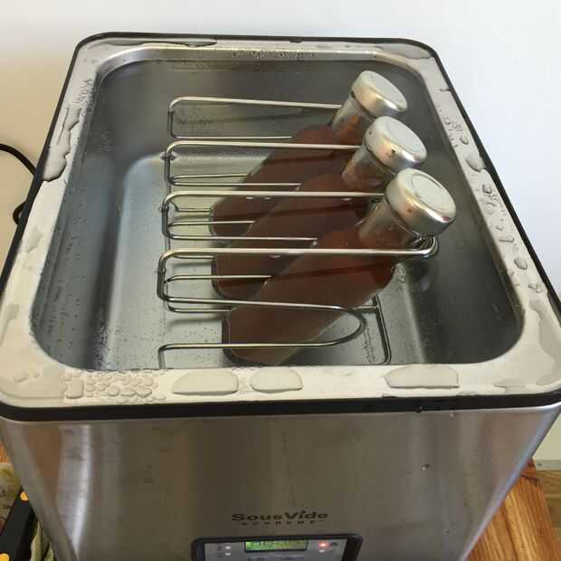 Poner las botellas en el baño de agua y añadir agua caliente si es necesario para que el nivel está por encima del nivel de la reserva en las botellas. Ponga la tapa en y espere hasta que el baño de agua alcanza la temperatura correcta otra vez (77 grados C), entonces el tiempo de 30 minutos.
