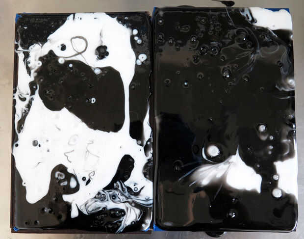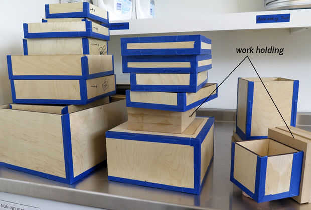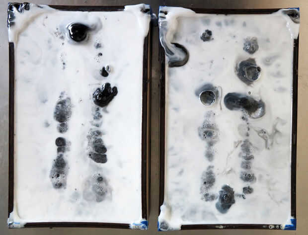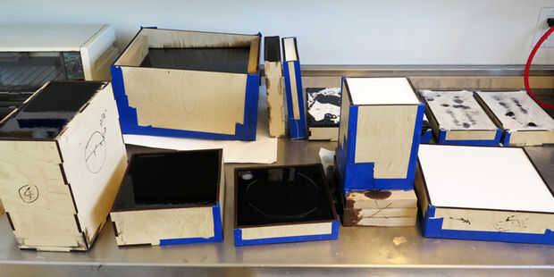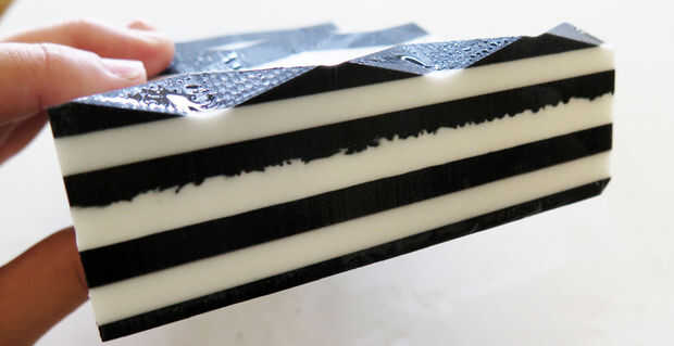 Resina de epoxy casting me permitió crear materiales únicos con varias rayas blancos y negros. El proceso empezó con una planificación cuidadosa de cómo la población de cada objeto iba a ser fundido. El tamaño de cada caja de bastidor depende de las dimensiones del objeto final, así como el material fundida se llevará a cabo en la máquina CNC. Por ejemplo, la habitación necesita ser añadido para el mecanizado de las lengüetas para sostener las piezas en flip mecanizado. Para unas cajas de fundición que se mecanizarán desde un ángulo diferente a la superficie de fundición (como el lado), trabajo especial celebración fue diseñado previamente.