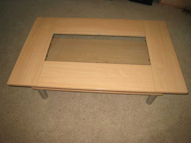 Comencé por prueba de montaje de las bisagras y tiradores. Lo primero que me di cuenta es que no van a caber sin retirar algún material de la junta superior. Cortar los bordes que en el interior de la mesa (donde estaba el vidrio) y luego calentar con el secador de pelo y alzaprima fuera con un destornillador de cabeza plana. Entonces tuve que Dremel a la madera un poco más para encajar las bisagras. Para asegurarse de que hubo bastante apoyo que decidí poner en tres bisagras.