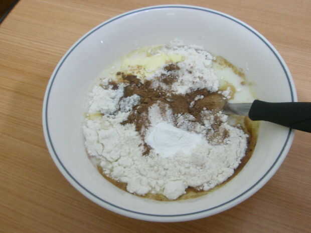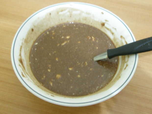 Poner todos los ingredientes y seguir mezclando hasta que la margarina es casi disuelto (está bien si consigues trozos poco en él).
