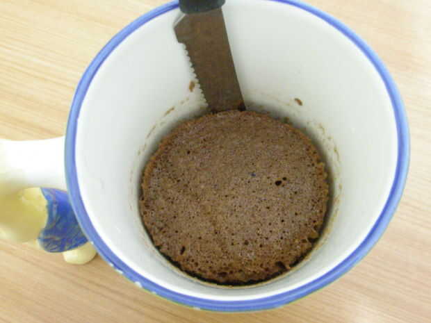 Una vez cocinada, suavemente separar la torta de la taza con un cuchillo y voltear sobre un plato.