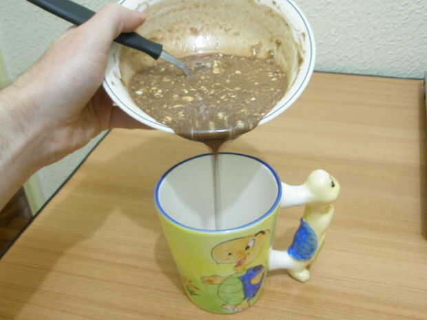 Como se puede ver en las fotos, tuve 2 tazas en forma agradables, así que vierte la mitad de la mezcla en la taza grande y había cocinado un pastel a la vez.