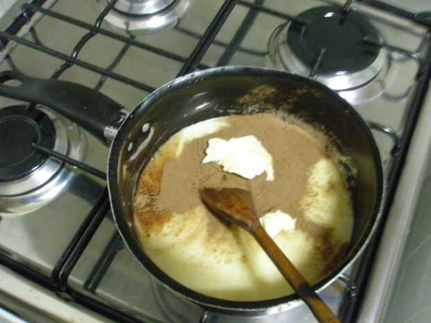 B-Agregue 2 cucharadas de cacao en polvo y 1 cucharada de margarina.