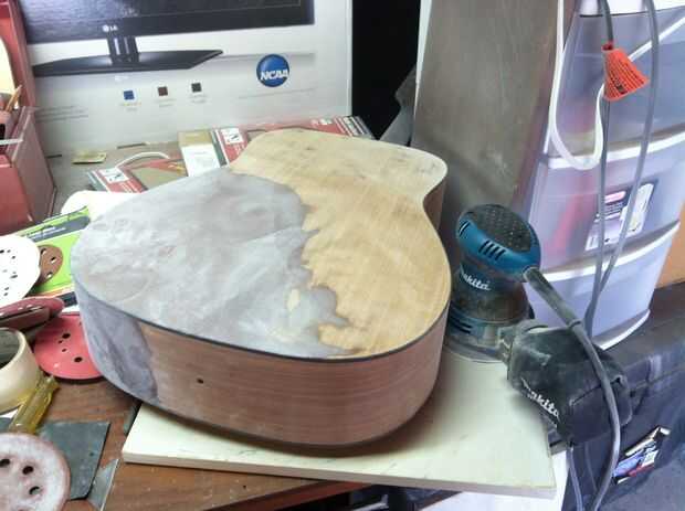 En primer lugar, quite todo el hardware de la guitarra y dejar a un lado. Ahora viene la parte tediosa, asustadiza. Usando papel de lija que van desde 150 a grano 320 y una lijadora orbital, tira con cuidado el acabado de poliéster por los lados y la parte posterior de la guitarra. Ir despacio y mantenga la lijadora nivel o podría comer a través de la chapa decorativa en capas feas.