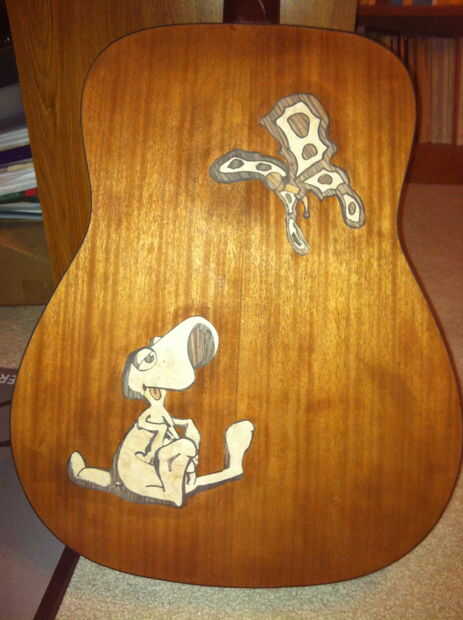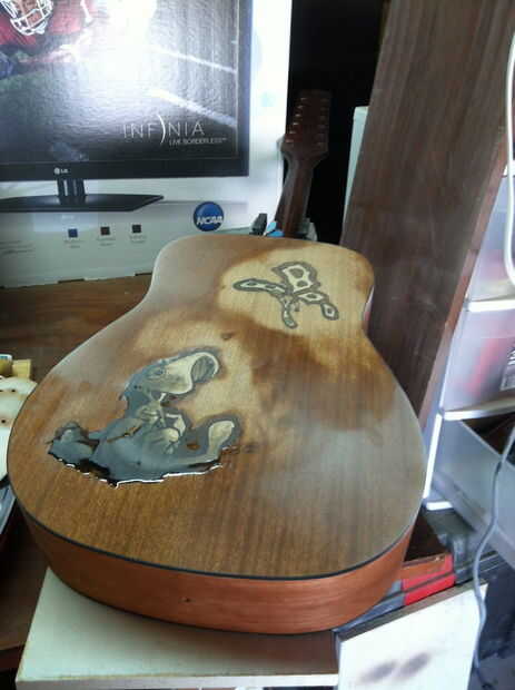 Al día siguiente, utilice la lijadora orbital para el diseño de la arena al ras con la superficie. Si su profundidad estaba bien, esto eliminará el epoxi de todo pero las líneas. También se eliminará la parte superior de la madera de embutido con tru-oil, dejando la madera desnuda embutido.