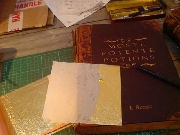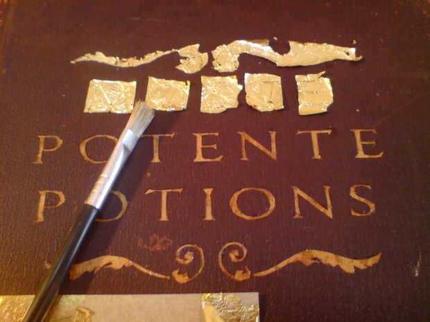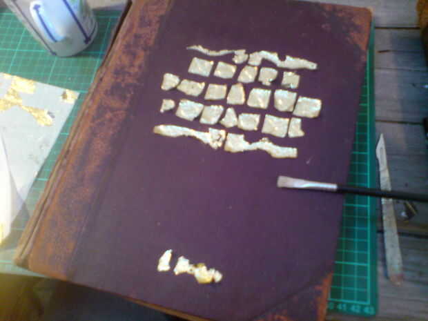 Aplicar ahora las secciones de pan de oro sobre las letras. Usar un bisturí y un cepillo muy duro para este proceso. El escalpelo para quitar la hoja de papel del forro, luego el cepillo para empujar la hoja en los bordes de la carta. La hoja debe quedar muy bien al tamaño de "abrir".