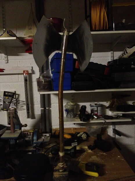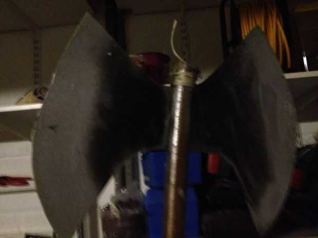 Primero se corta el palo del tamaño correcto, mina aproximadamente 2 pies de largo, cortar la otra final también para que tenga un final agradable. Luego cortar verticalmente alrededor de 5/6 pulgadas hacia abajo, mi plástico era alrededor de 3mm de espesor por lo que cabe perfectamente, pero verifique el ajuste y tomar tu tabla para picar, utilice un marcador o algo que escribe sobre el plástico y extraer una forma de 'H' grasa, cada lado debe ser alrededor de 4 pulgadas de espesor, luego dibujar curvas en para que sea señalado. Luego spray plata y negro Si lo desea o lo que quiere, siempre culour ranura en el palo, un gancho agarrador de la cadena y envolver la parte superior de su cadena, entonces caliente glur, recortar los bordes y tiene un hacha! Como toque terminando decidí envolver alguna cadena más como un mango.