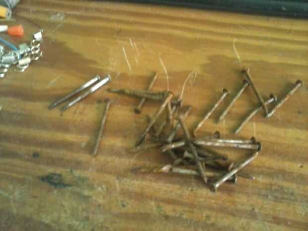 Las uñas sólo tenía, eran éstas oxidados que habría horribles. Por lo tanto, utilicé una herramienta dremel y un archivo para quitar el moho de la cabeza del clavo y la parte superior ~ 1,5 cm del eje.