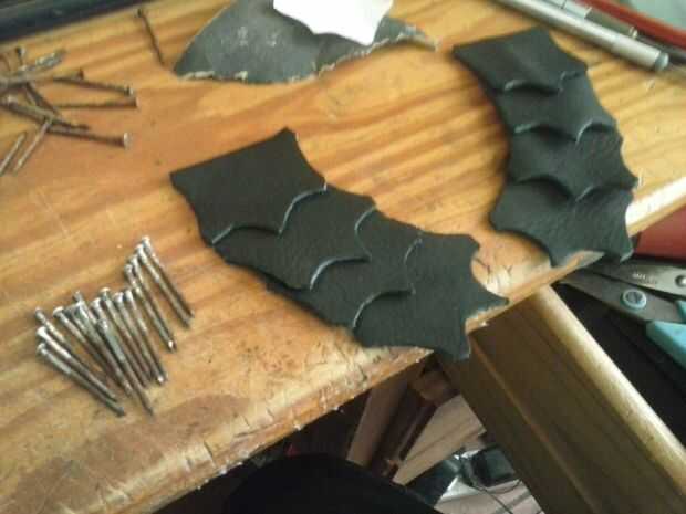 Para obtener todos los segmentos de cuero de la misma forma y tamaño, es mejor elaborar una plantilla de papel primero, entonces trazar sobre la piel para cada segmento. La forma depende de ti, y el tamaño de los segmentos que utilicé fue de 5 cm de ancho (lado plano) y 4,5 cm de largo (de la parte plana de la punta). En total, de los segmentos regulares (no la media espalda y delanteros segmentos del collar), debe agregar hasta 20 (10 por lado)