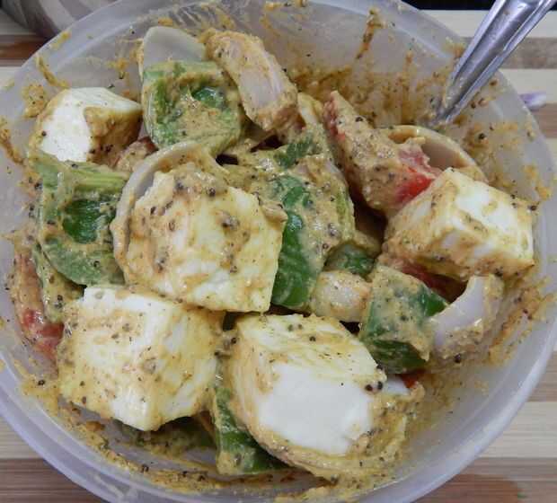 Añadir verduras y piezas de paneer y mezclar suavemente con las manos para que piezas de paneer no romper, cubrir y dejar que las verduras marinadas reposar 6-7 horas en el refrigerador.