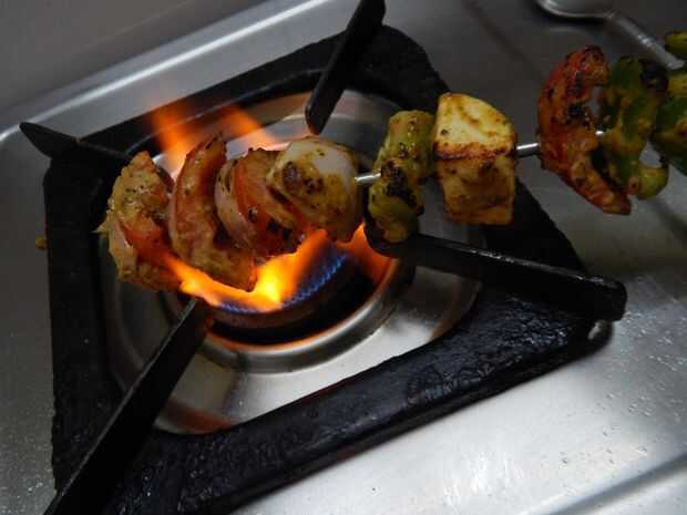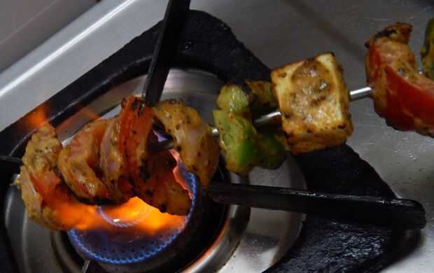 Calentar un tawa antiadherente a fuego medio. Lugar una vez caliente la broqueta en el tawa, superficial freírlas... vuelta y cocine todos los lados hasta que se doren (cada lado durante 2-3 minutos).