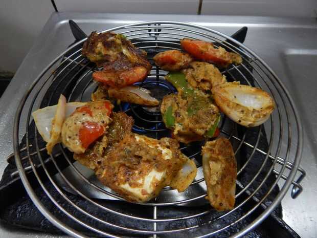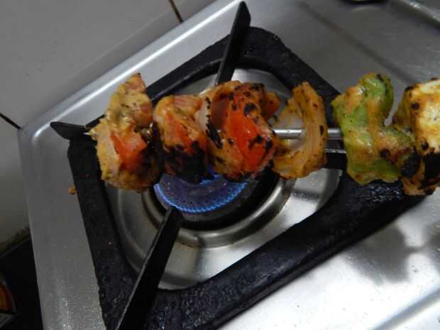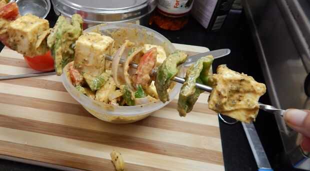 Arreglar el paneer en los pinchos y verduras... no importa el orden, pero mantener cierta distancia aprox 0.5 cm entre cada pieza de verdura o paneer para incluso cocinar y también marinada no degustar crudas así.
