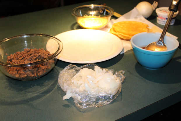 2-tapa tortilla será carne de la hamburguesa (Recuerde que usted tendrá que hacer esto 3 veces más, dejar suficiente carne para todos!)