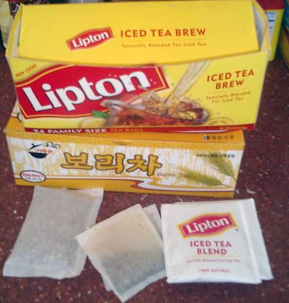 Para el té, mi abuelas usan Lipton o Luzianne, las grandes bolsas de té helado para hacer varios cuartos al mismo tiempo. Una de mis abuelas agrega una pequeña bolsa o dos de observación constante. Para el ~ 3 cuartos de galón de té dulce que hice ayer, usé dos bolsas grandes de té helado Lipton, dos bolsitas de té de achicoria tostada (hierbas) y una bolsa de té de cebada en el mercado coreano por la calle. (No «auténtico», pero muy sabrosa de una manera un poco de grano tostado). Adición de una bolsa de algún tipo de picante chai también funciona bien.