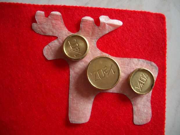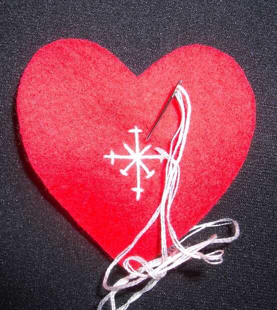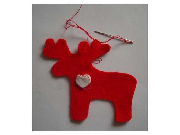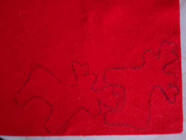 Como alternativa a bordado en hilo blanco, podría coser un círculo o un corazón de fieltro blanco sobre el rojo forma con pequeñas puntadas de funcionamiento en uno o dos filamentos de algodón rojo y luego si desea bordar un diseño a través de ambas capas en algodón rojo. Ver los renos y el árbol de Navidad fotos de ejemplos.