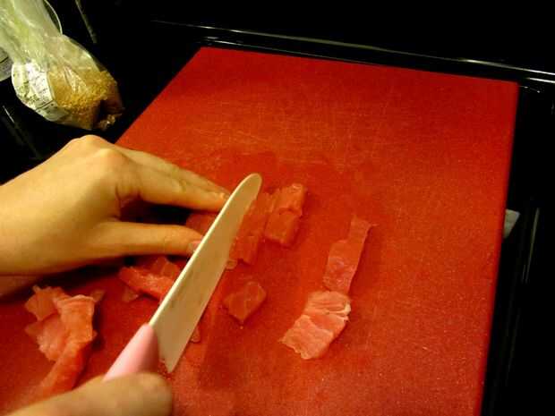 Corte que necesita corte. Las cebollas y atún debe ser cortado en trozos pequeños.