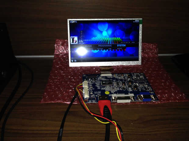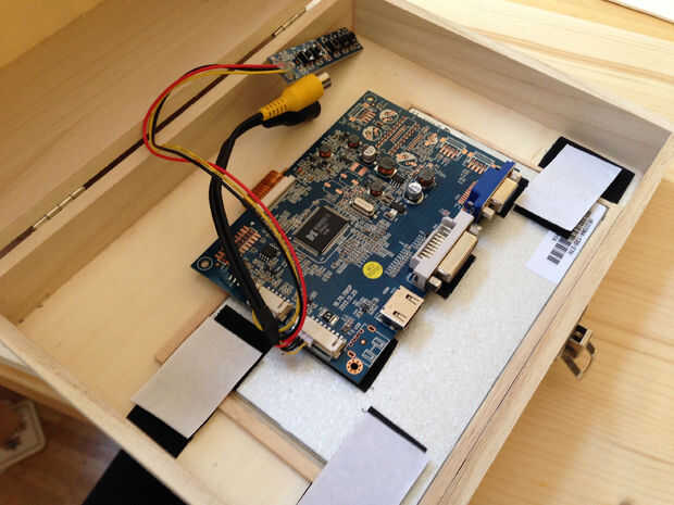 Quería que la pantalla sea extraíble en caso de que algo en la caja tiene que ser cambiado. Así que decidí usar la cinta de Velcro para la fijación de la pantalla. Esto hace fácil separar la pantalla simplemente retirando la cinta. Placa base de la pantalla se une a la parte trasera de la pantalla también con cinta de Velcro. Es importante que la parte trasera de la placa base no toque la parte exterior de la pantalla de lo contrario habrá un corto. Si la cinta es gruesa suficiente esto no debería ser un problema.