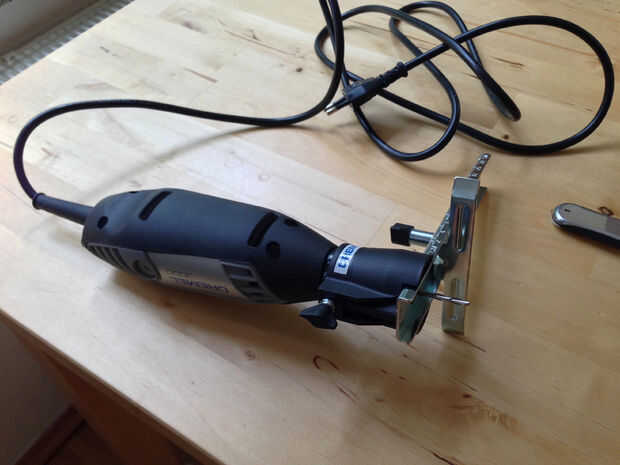Para el montaje de la pantalla a la caja de madera se debe cortar un rectángulo. Usé una Dremel con una guía de borde recto (Dremel 678) aquí. Seguramente se puede también utilizar una sierra de marquetería. Don' t corta el rectángulo grande porque tienes que alisar los bordes con papel de lija después.