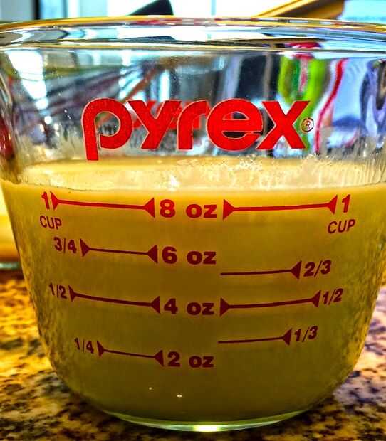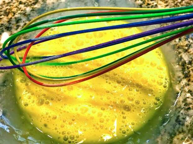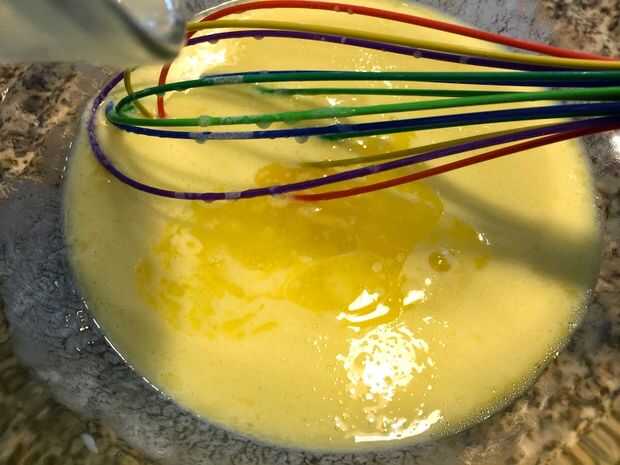 En un medio separado tamaño del tazón de fuente, combinar y batir los huevos, suero de mantequilla, chiles verdes en cubitos y mantequilla derretida.