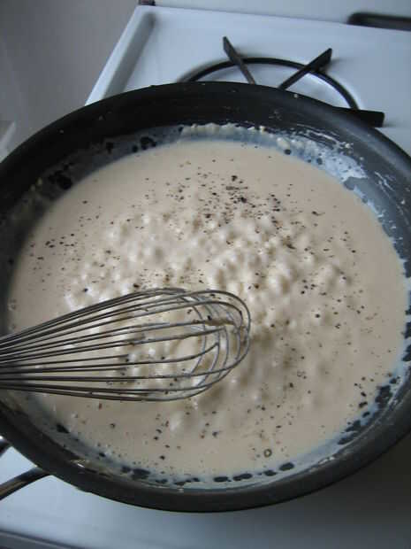 Una vez que la salsa haya espesado, añadir una buena cantidad de pimienta negra molida. Luego, se desmoronan uno de las hamburguesas de salchicha y tire.