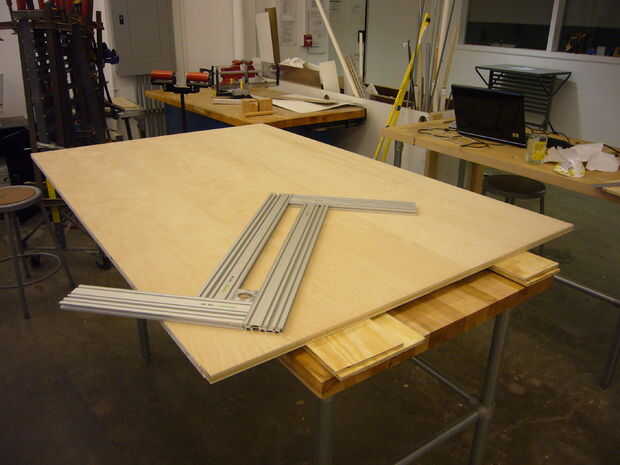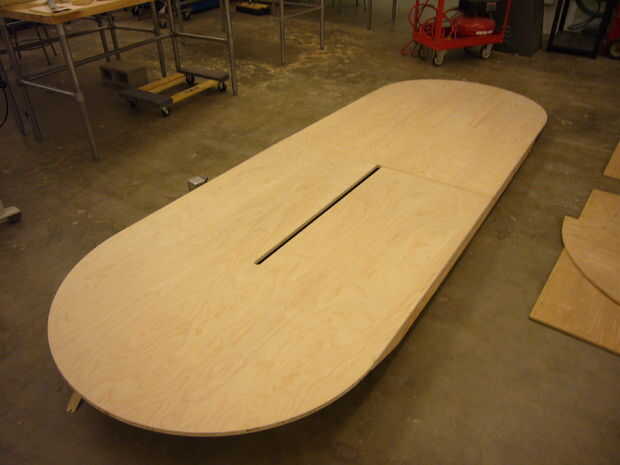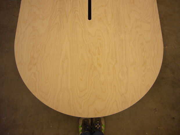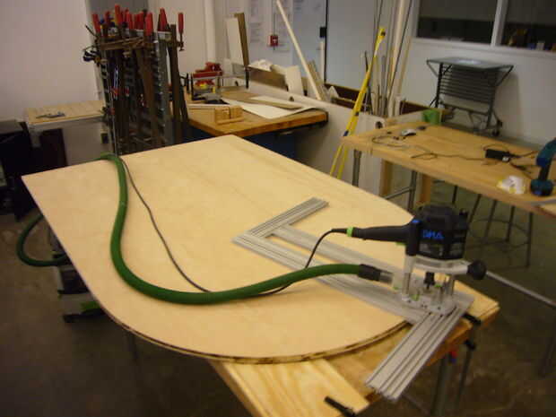 Para empezar, compré dos hojas de gruesos, 3/4 contrachapado de abedul y los corta de 4 x 8 a 4 x 6'. En la tienda, configurar un router para cortar un círculo de radio 2' y centrado en lo unos 2' desde el borde de la pieza, centrada. Yo en un círculo los bordes de la madera como en las imágenes de abajo, por lo que sería una pista para correr. Para cortar la ranura en el centro, simplemente perforar un agujero de diámetro de 1" a una distancia de mi elección, y con una sierra de mesa, corté la madera dos veces, sólo hasta los bordes del círculo. Listo, una simple pista de forma.