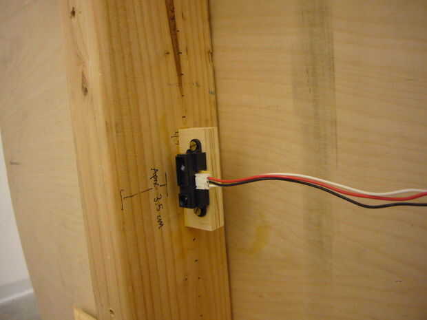 En un prototipo temprano, he usado botones en cada extremo, pero por la cantidad de peso que golpea el suelo, no es aconsejable utilizar una solución mecánica, como cosas como botones tienden a romperse con el tiempo con un uso intensivo. Así que mi solución es estrictamente óptico. Dos sensores de proximidad en cada extremo busca una gama de umbral. La lógica es la siguiente: Si este sensor de proximidad es de unos 3mm desde el suelo, y al contrario uno es unos 10mm del suelo, que sabemos que este extremo de la pista ahora está tocando el piso, etc..