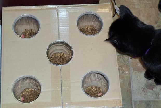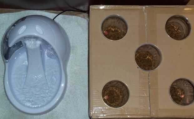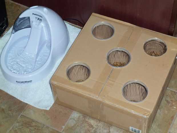 Grabado en la caja cerrada y trazado alrededor de las tazas que estaría utilizando. A continuación adjunto el cortador de círculo a mi Dremel y establece en 10.000 rpm y cortar y quitar el interior medida del círculo, por lo que el borde de la taza sentarse en la parte superior del cartón y no caer. Usé 6 oz tazas de partido para que los gatitos fácilmente podrían poner su cabeza en la copa o usar su pata para comer con. Un gato le gusta intentar pegar su cabeza entera en, y la otra le gusta agarrar la comida con su pata. Mi gato gris y blanco no muy averiguado lo todavía, así que todavía le damos un tazón de fuente a veces, pero lo hace mejor.