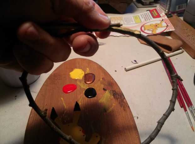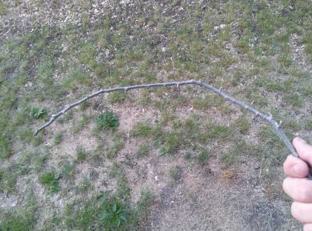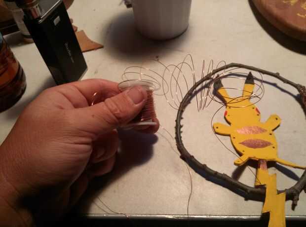 Me salió y encontró una pequeña extremidad verde para hacer la camilla. Se quitó las pequeñas ramas dejando solamente la parte principal de la rama. Que es verde en voz alta a la curva en un círculo. (Si mal recuerdo justo papá usa plantones en el gato montés). Me aseguré que la piel se encajan y usando un pedazo de alambre de cobre ¢ 28ga comprometidos los extremos de la rama y terminó apretado.