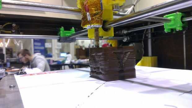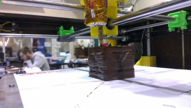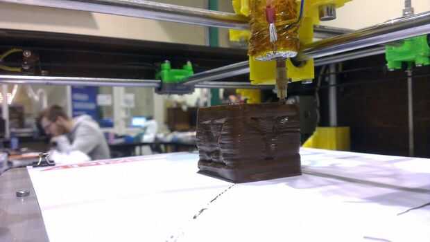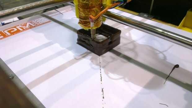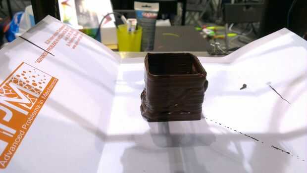 Intenta primero usamos el chocolate con leche más barato de la tienda más cercana. Como resultado fue derretido fácilmente (30° C), pero después de la extrusión se quedó derretido para aproximadamente una hora, bajo el gran cooler (120mm 220v). Esto no es una buena manera de imprimir algo. Así que compramos un chocolate oscuro y se derritió más duro pero un poco (35° C). Pero estas temperaturas son aproximadamente 3° C menos de temperatura real del interior de chocolate. Entonces esperamos hasta que todo el aire burbujas vendría fuera de la jeringa y sólo a continuación, inserte el émbolo. Entonces esperamos hasta la temperatura bajaría a 26° C, lo que significa 29-30° C interior o un poco más alto. el resultado fue mucho mejor pero no perfecto. Así que necesitamos añadir más refrigeración, pero si el flujo es alta sería sólo sople el chocolate el lugar y el objeto sería roto.